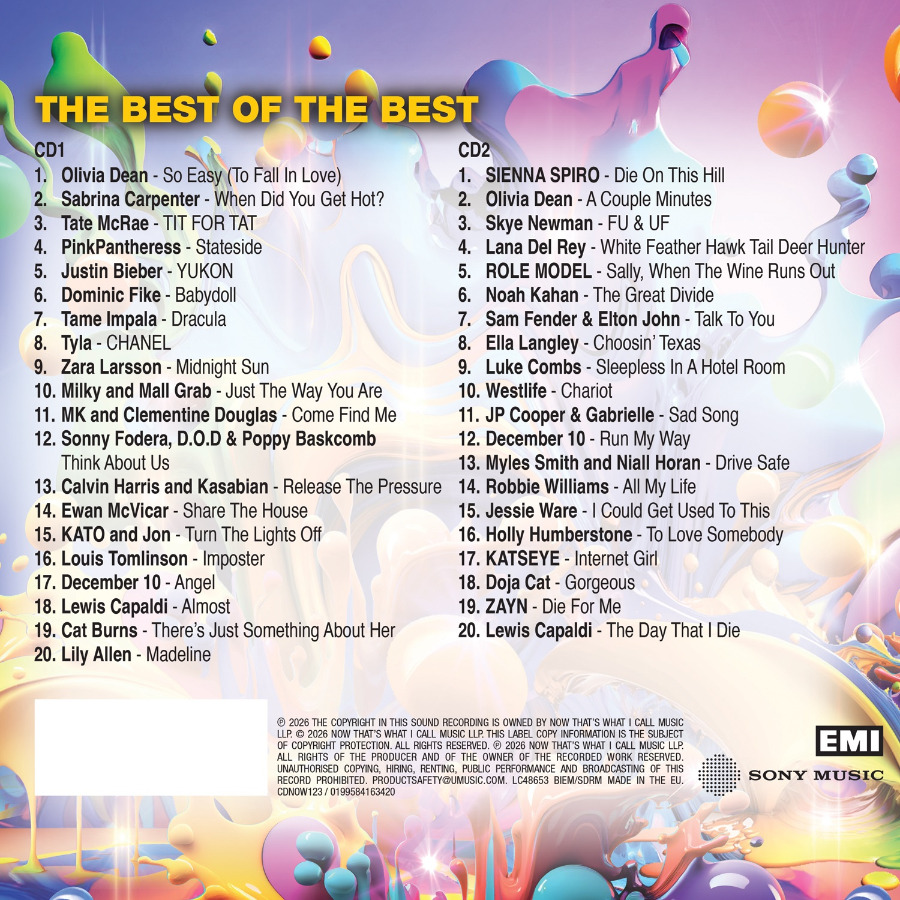 CD2 opens with a run of standout tracks, featuring SIENNA SPIRO with the debut hit ‘Die On This Hill’ alongside more magic from Olivia Dean with ‘A Couple Minutes’, and the superb voice of Skye Newman on ‘FU & UF’. Global icons are here – including Lana Del Rey, Sam Fender and Elton John with ‘Talk To You’ and folk infused pop from Noah Kahan with ‘The Great Divide’ plus country-pop highlights from Luke Combs and Ella Langley. The second half brings together established pop voices and contemporary chart regulars including Westlife, JP Cooper with Gabrielle, and the huge collaboration from Myles Smith and Niall Horan with ‘Drive Safe’. Closing the collection – a mix of enduringly popular artists including Robbie Williams, Doja Cat and ZAYN are complimented by newer acts KATSEYE and December 10, ahead of closing with the powerful ‘The Day That I Die’ from Lewis Capaldi.